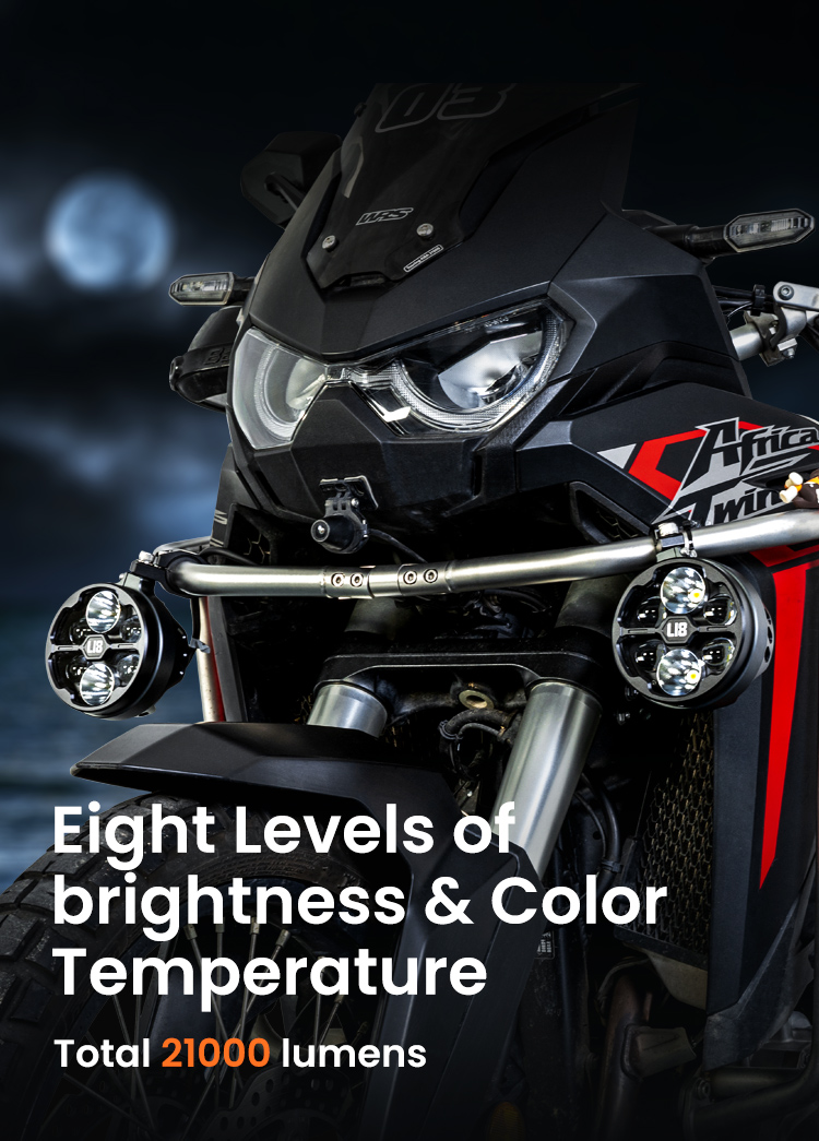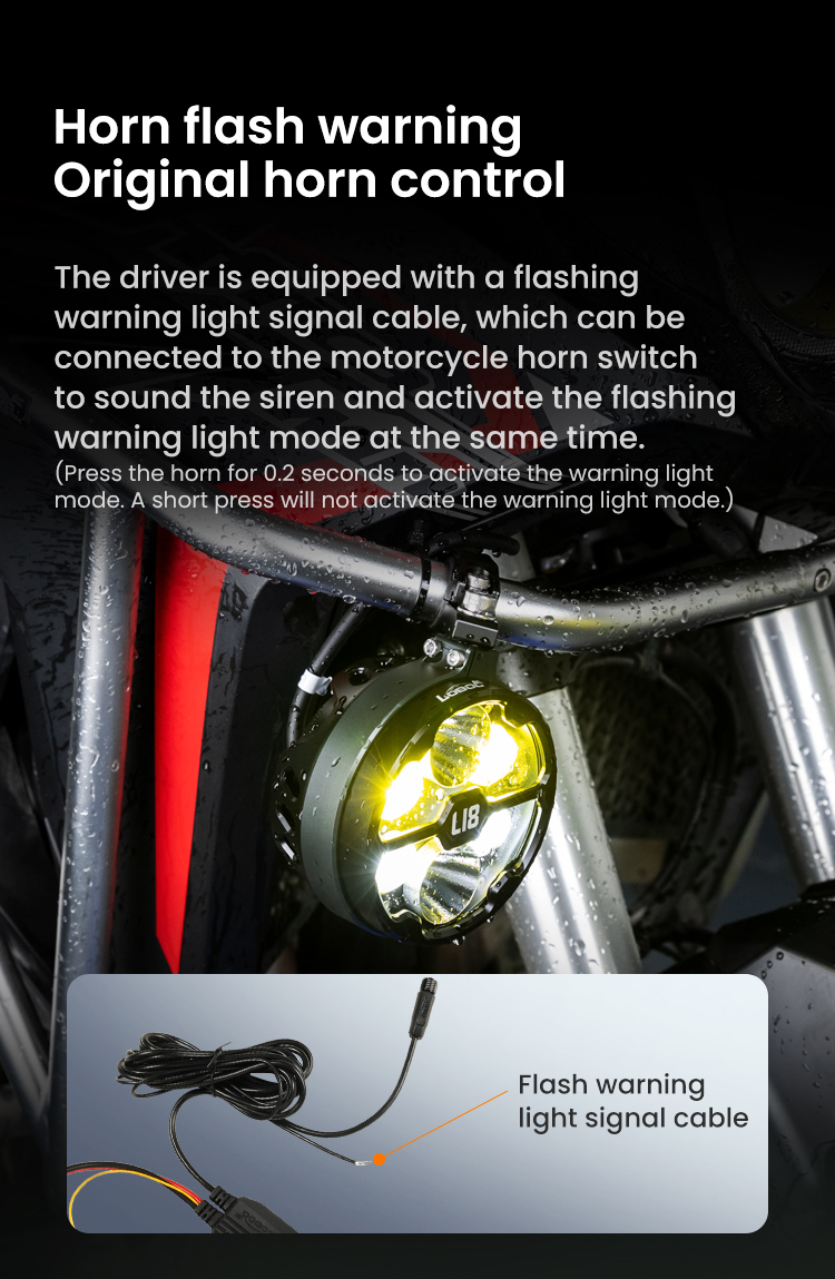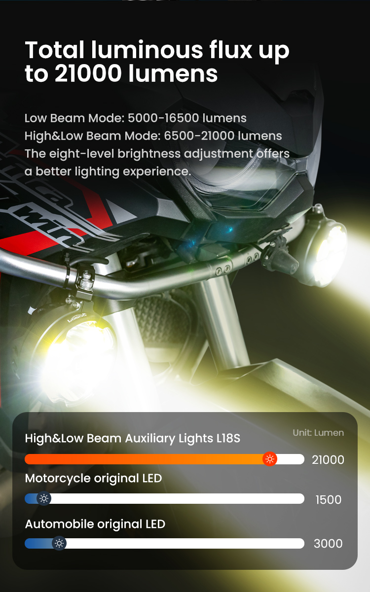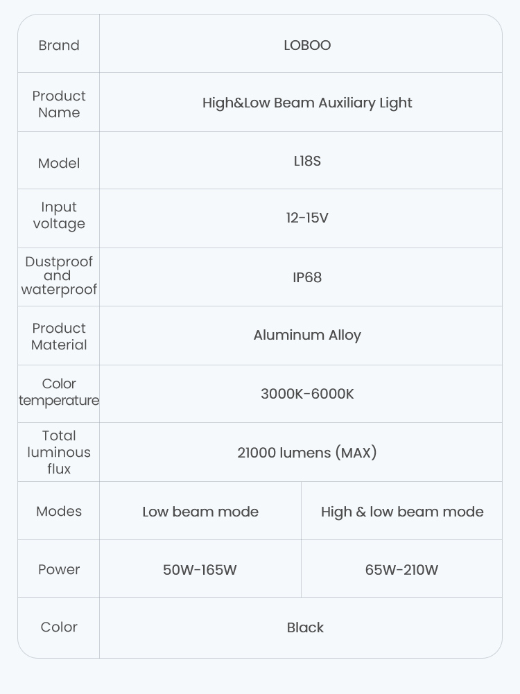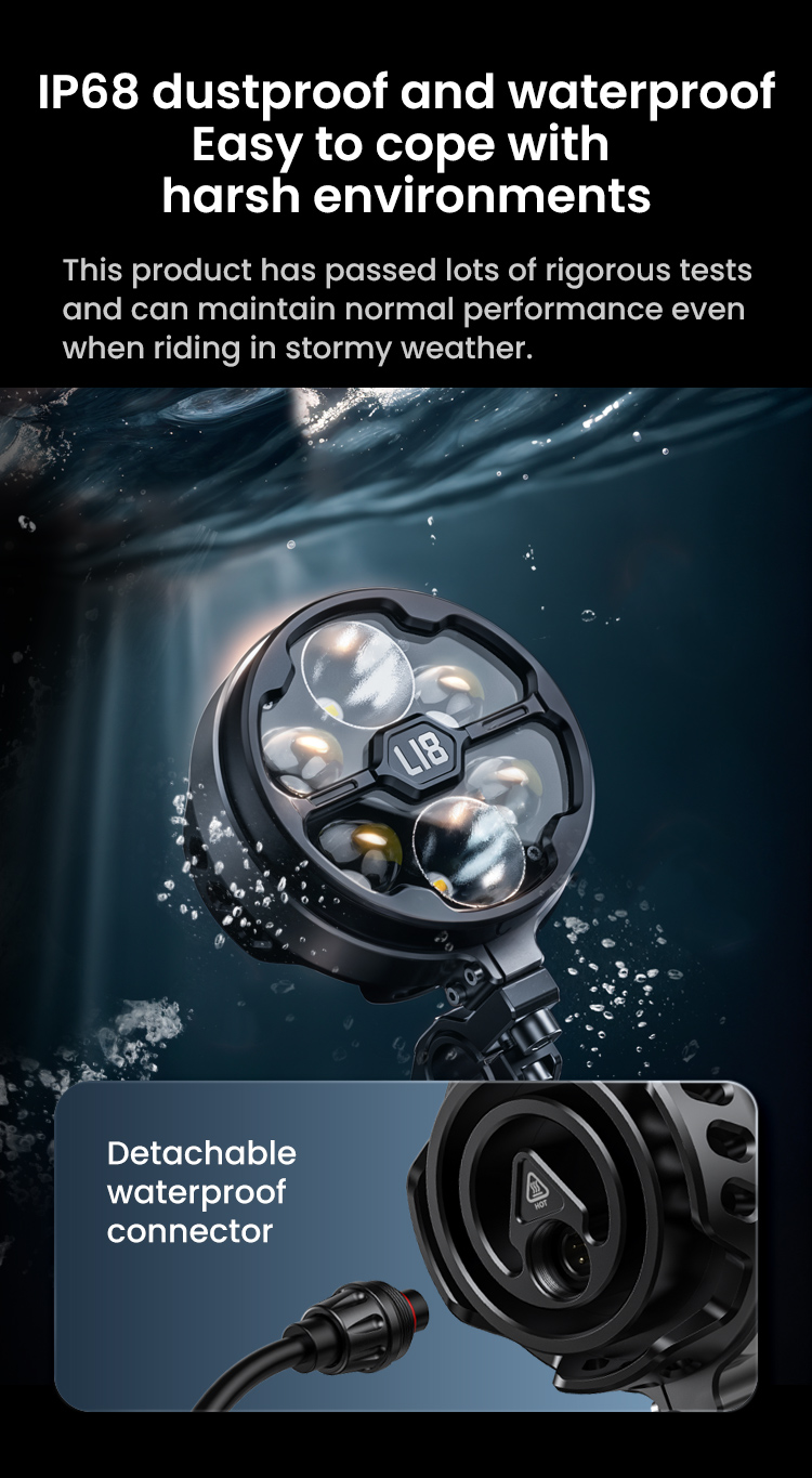 Total luminous flux: 21000 lumensHigh&low beam integratedIntelligent temperature control protectionThree warning light modesIP68 dustproof and waterproof
