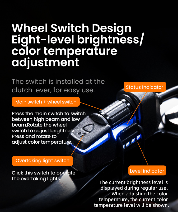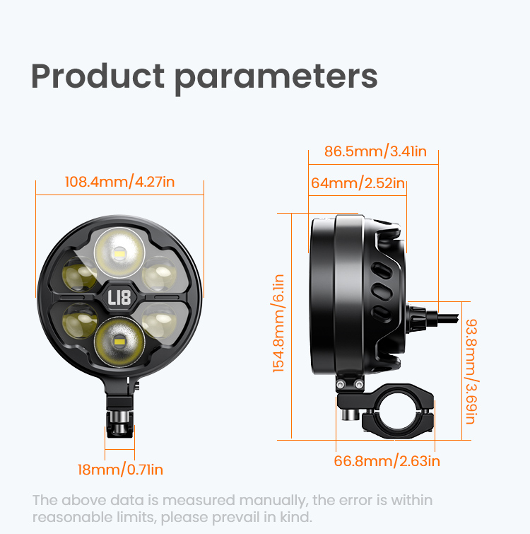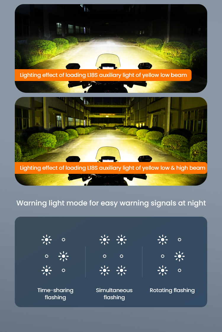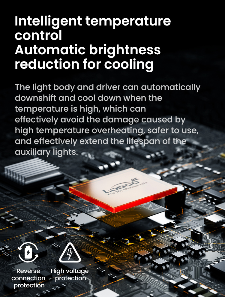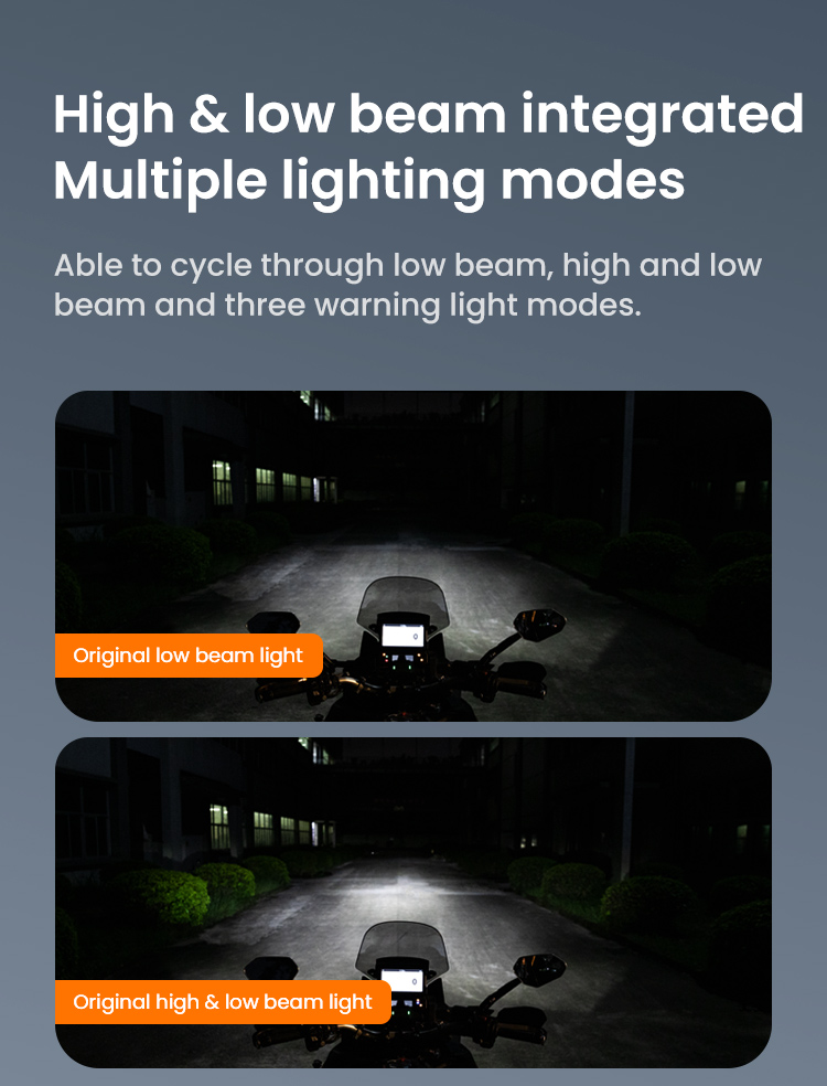 Total luminous flux: 21000 lumensHigh&low beam integratedIntelligent temperature control protectionThree warning light modesIP68 dustproof and waterproof