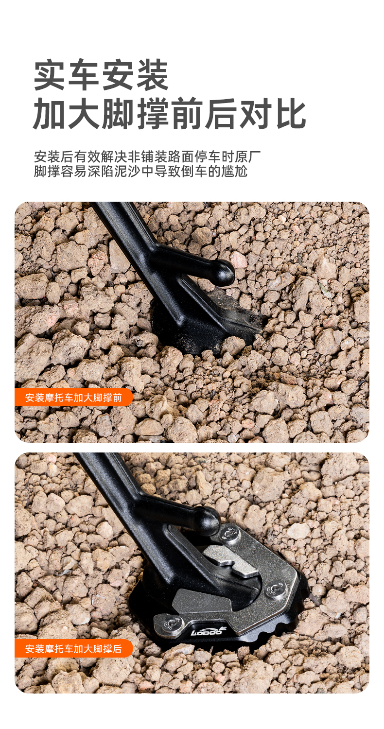 增加侧脚撑面积,应对非铺装路面