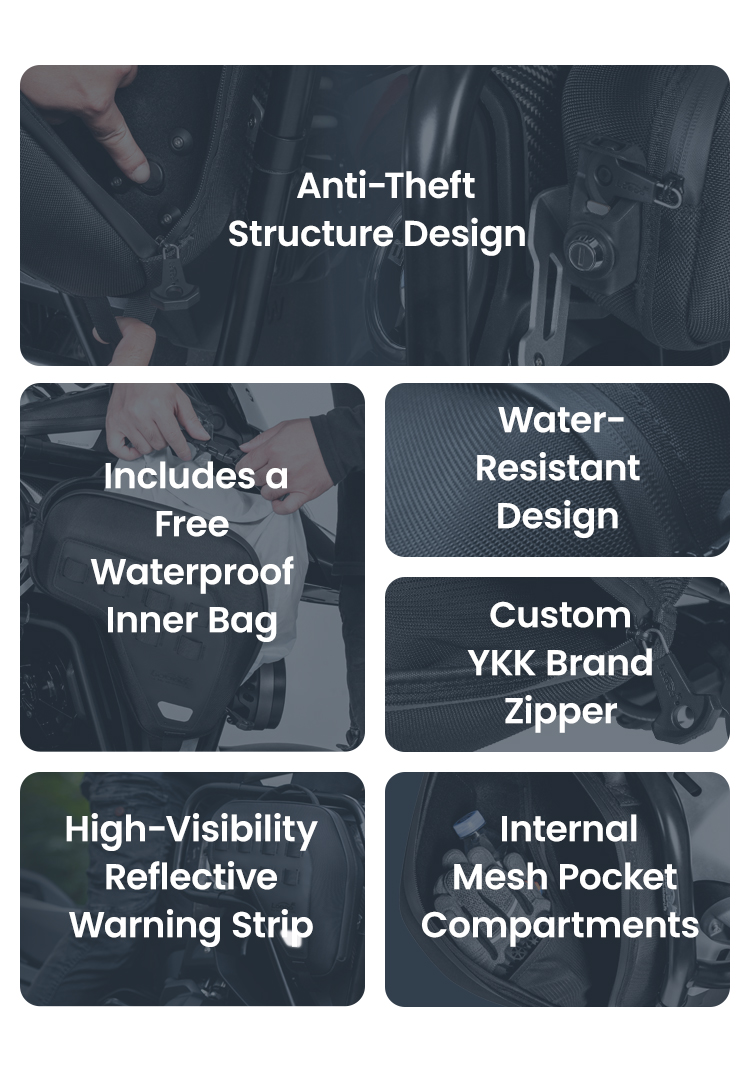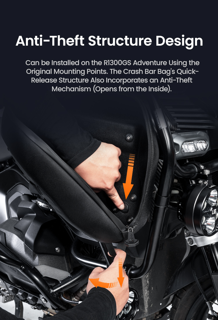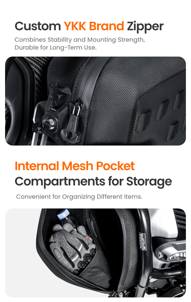 Compatible with R1300GS Adventure Original Mounting Points Anti-Theft Structure Design Includes a Free Waterproof Inner BagWater-Resistant Design Custom YKK Brand Zipper High-Visibility Reflective Warning StripInternal Mesh Pocket Compartments