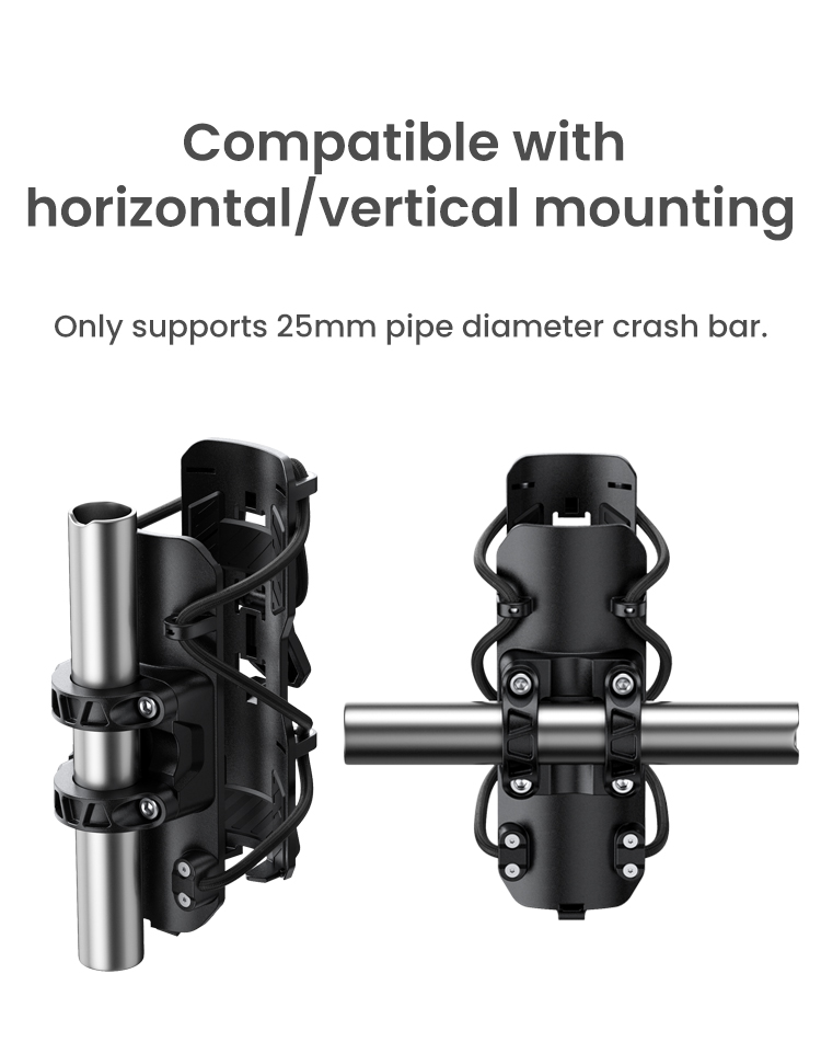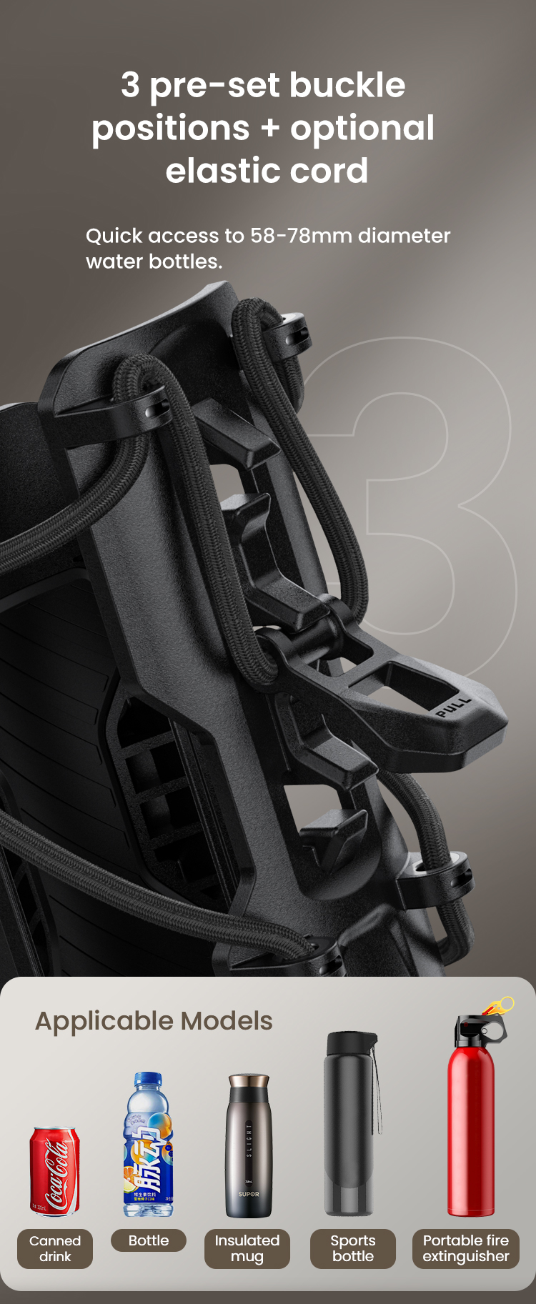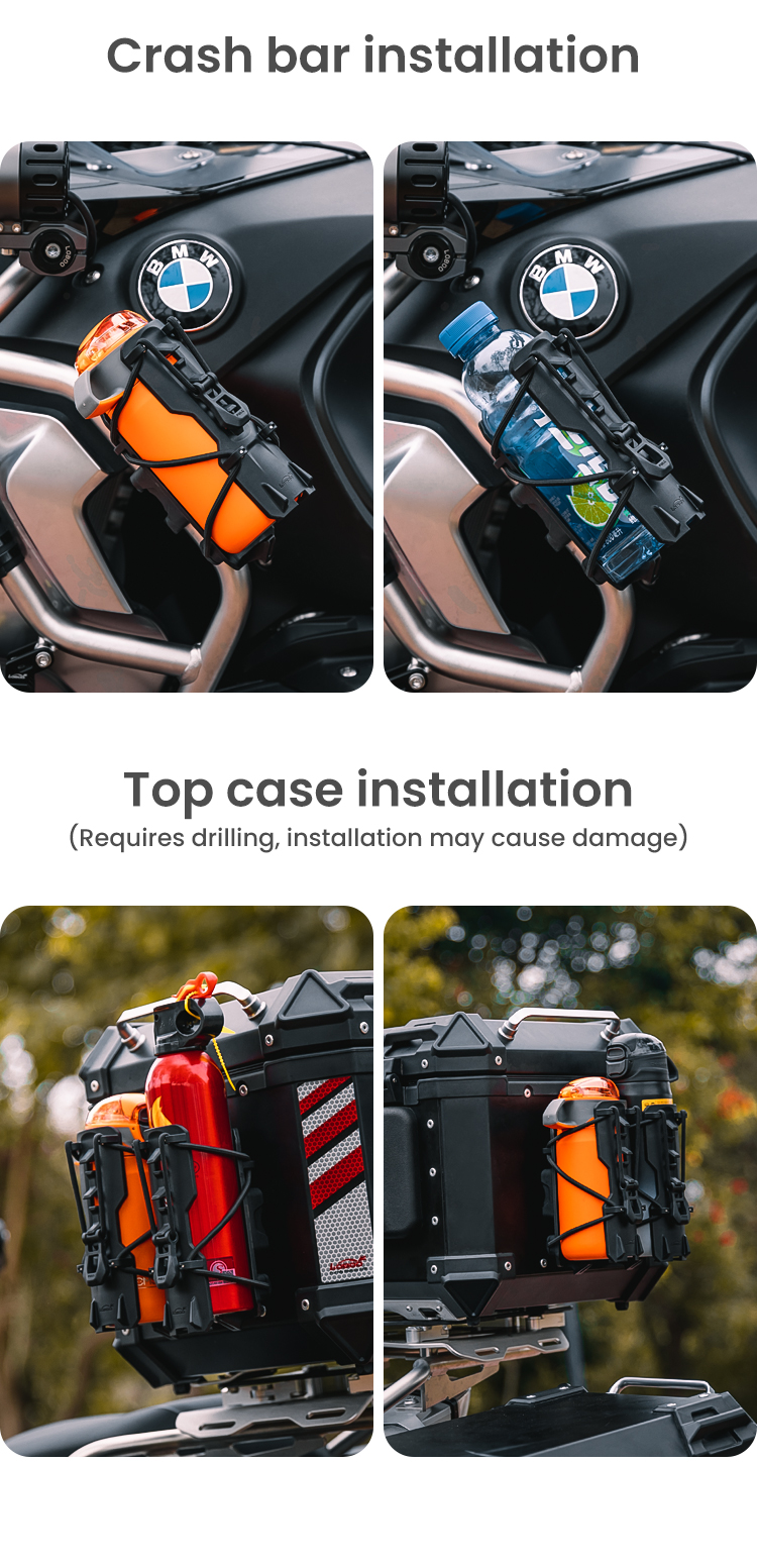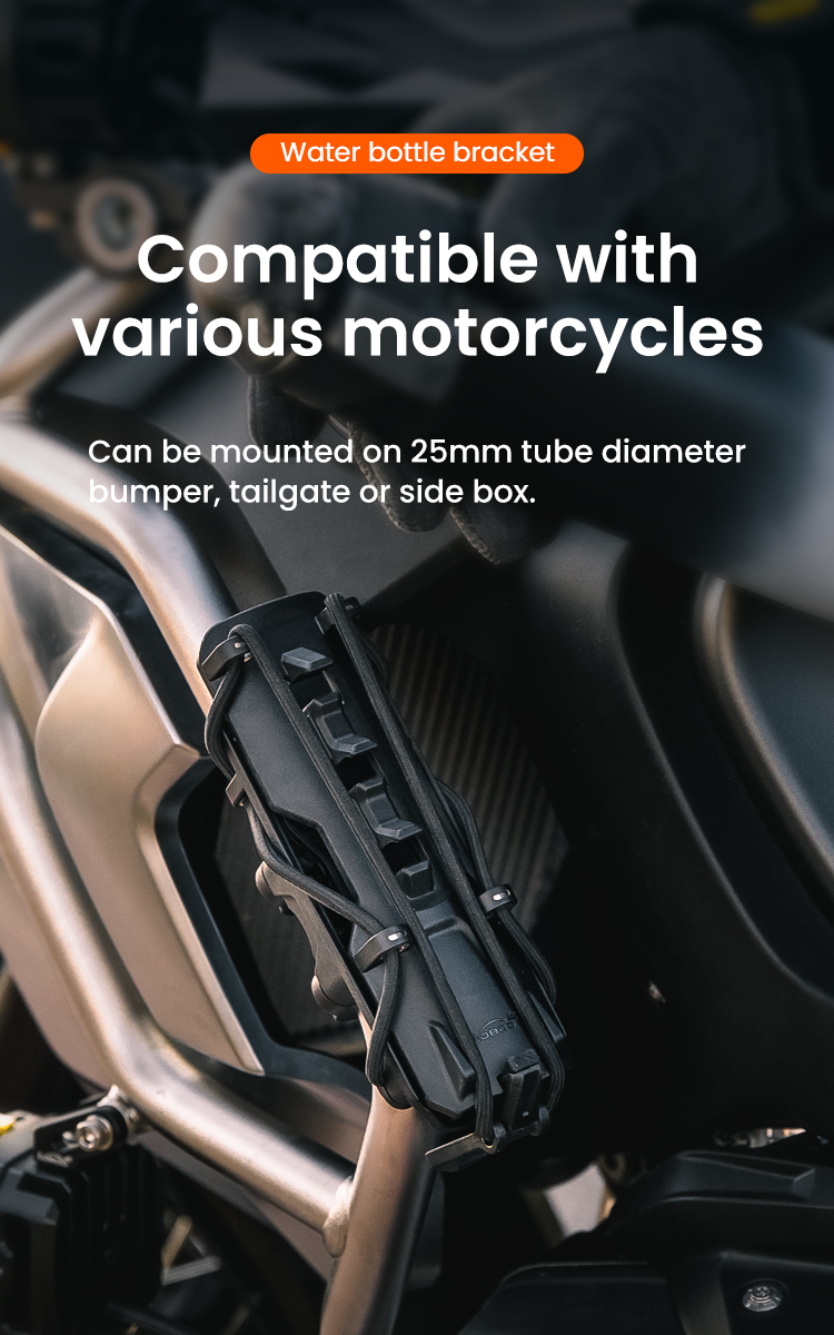 One-piece design with adjustable buckleCompact size for storagePreset buckle positionsApplicable for water bottles with a diameter of 58-78mmCan be installed on 25mm diameter crash bars or side/top cases
