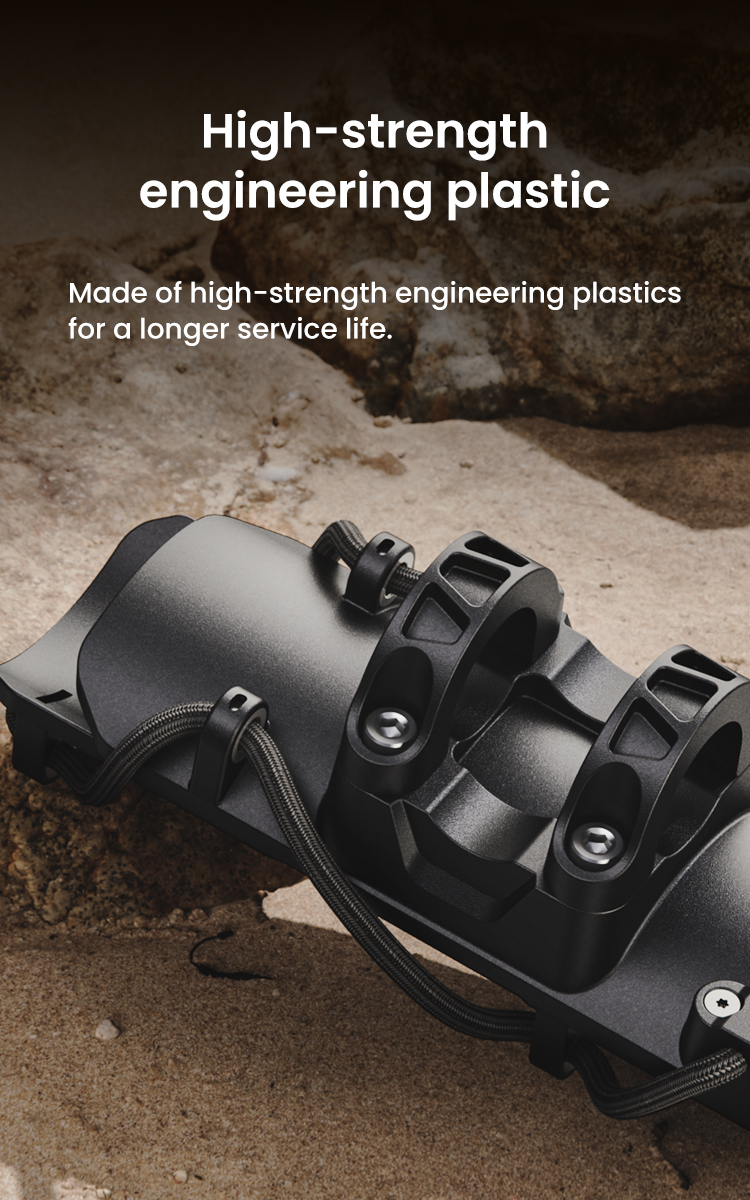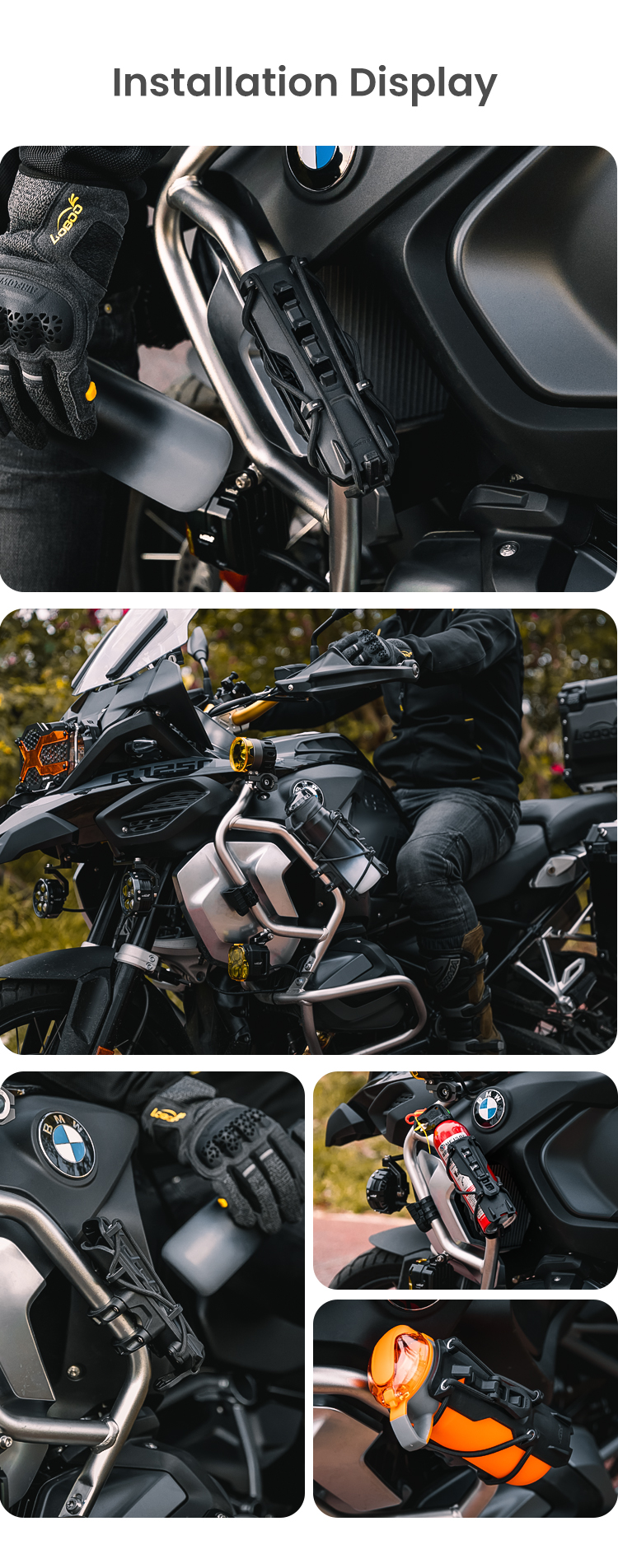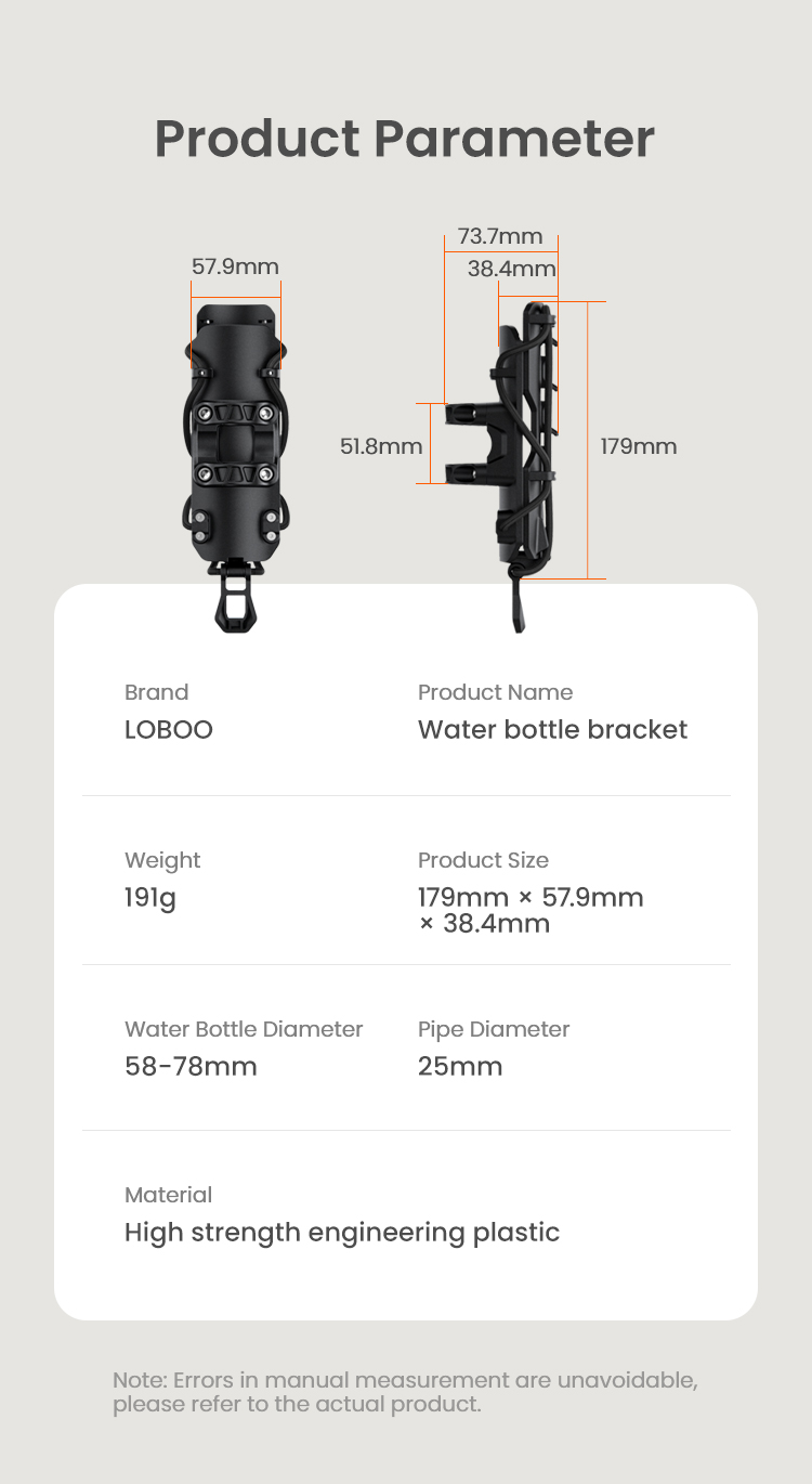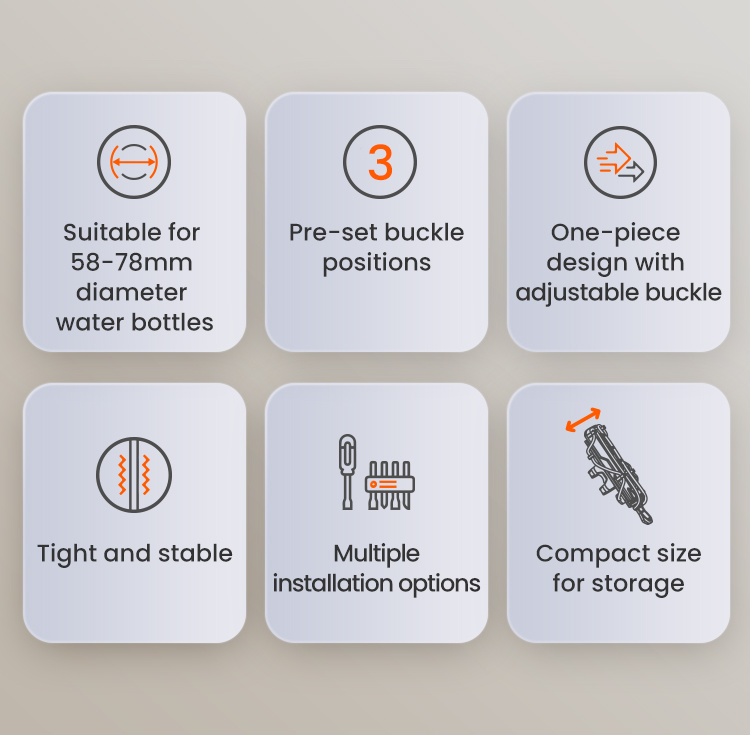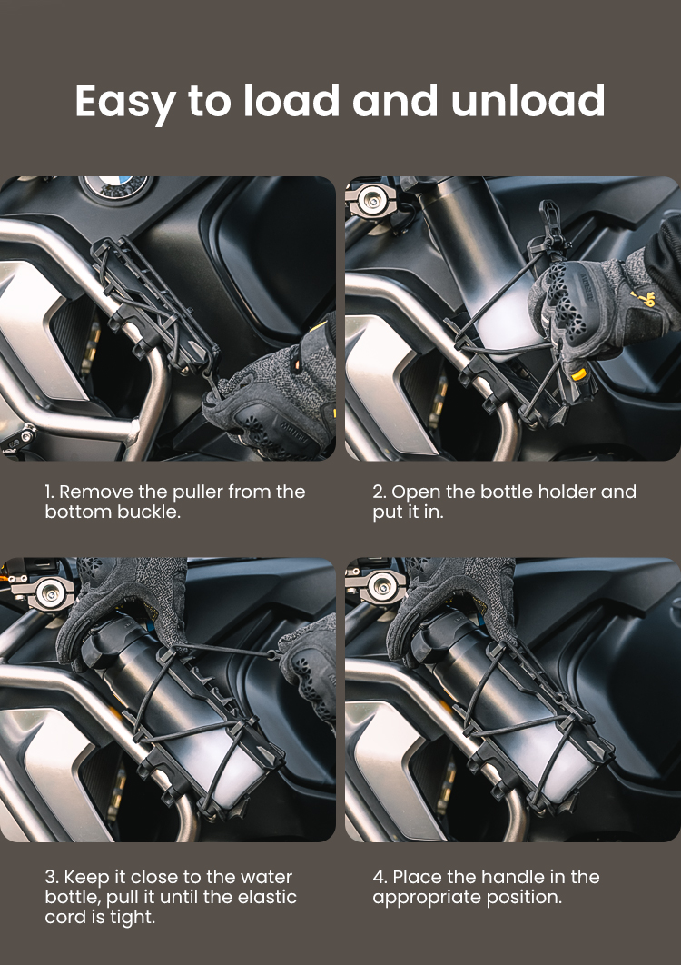 One-piece design with adjustable buckleCompact size for storagePreset buckle positionsApplicable for water bottles with a diameter of 58-78mmCan be installed on 25mm diameter crash bars or side/top cases
