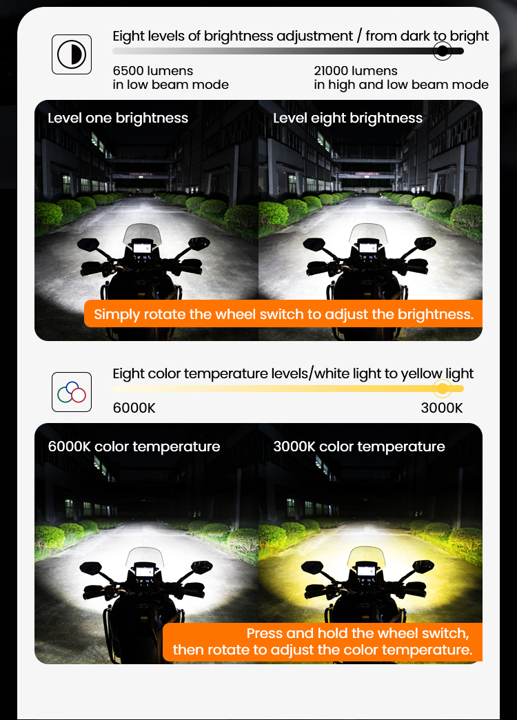 Total luminous flux: 21000 lumensHigh&low beam integratedIntelligent temperature control protectionThree warning light modesIP68 dustproof and waterproof